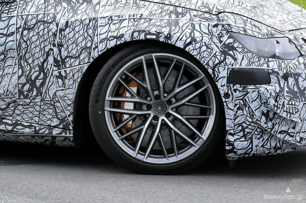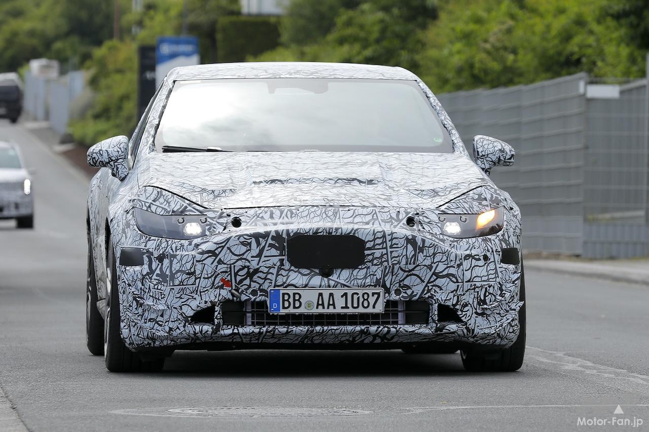 ニュル付近で捉えたAMGバージョンのフロントエンドには、特徴的なLEDヘッドライト、彫刻的なフロントグリル、アグレッシブなカナード、大型エアインテークを装備、足まわりではブロンズキャリパーを備えた強力なブレーキシステムや、ドリルドブレーキディスクを装着、より低くより硬いサスペンションを装備している。