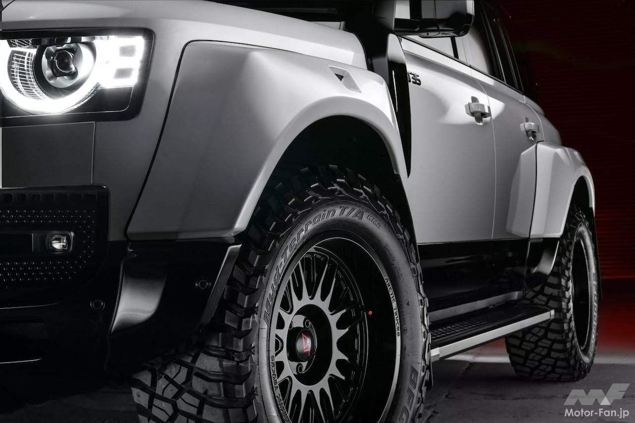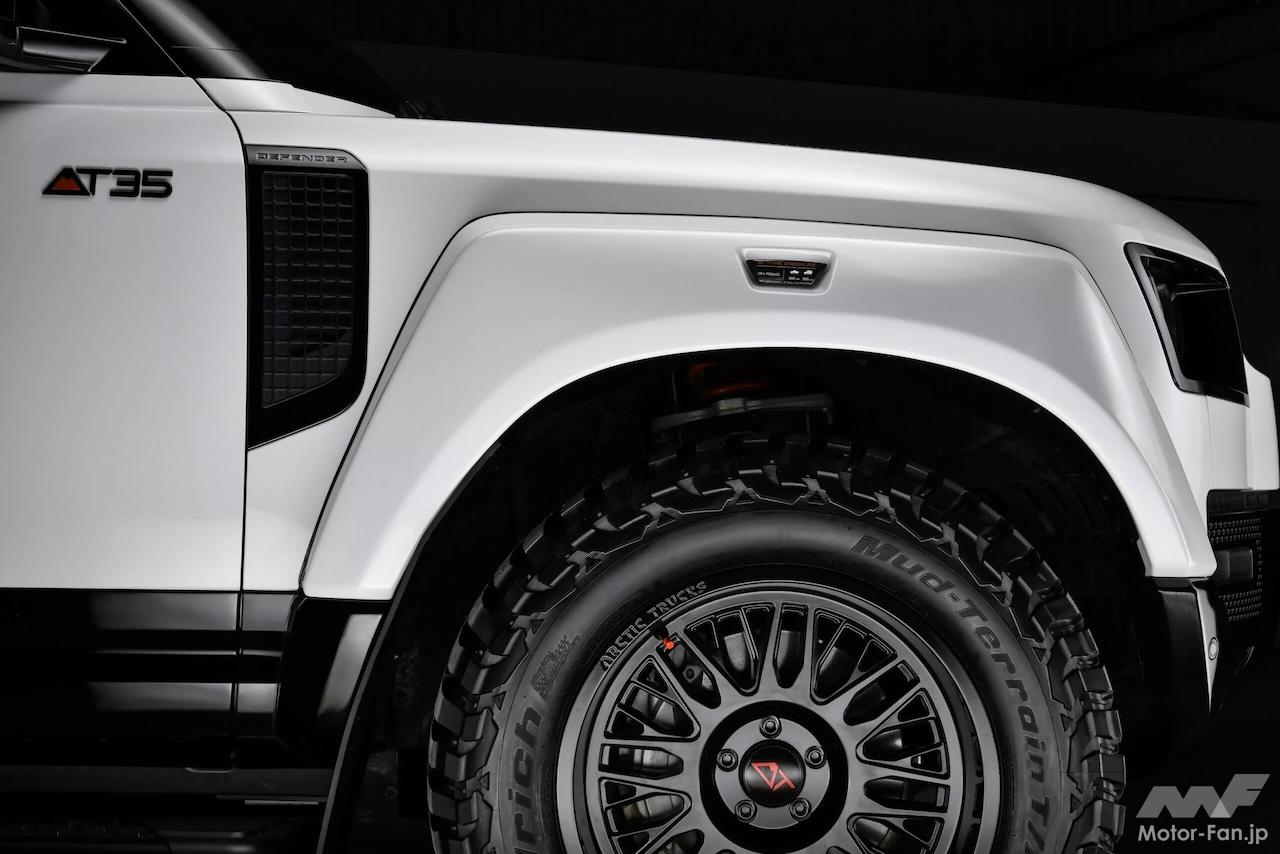 「ディフェンダーAT35」は、20インチの鍛造アルミホイールに、35インチのBF Goodrich KO2オールテレーン、またはマッドテレーンタイヤが装着される。大幅に大型化されたこのタイヤには、ボディカラーまたはブラックのどちらかで仕上げることができる、巨大なフェンダーフレアが組み合わされている。