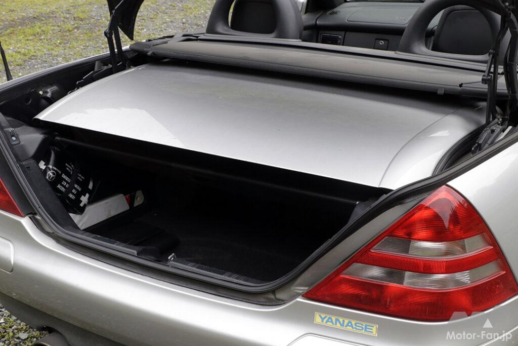 ルーフは電動。今でもスムーズに動いている。収納先はトランク上部。オープンにした場合でも、1泊2日程度の荷物ならルーフ下にトランクスペースが確保されている。