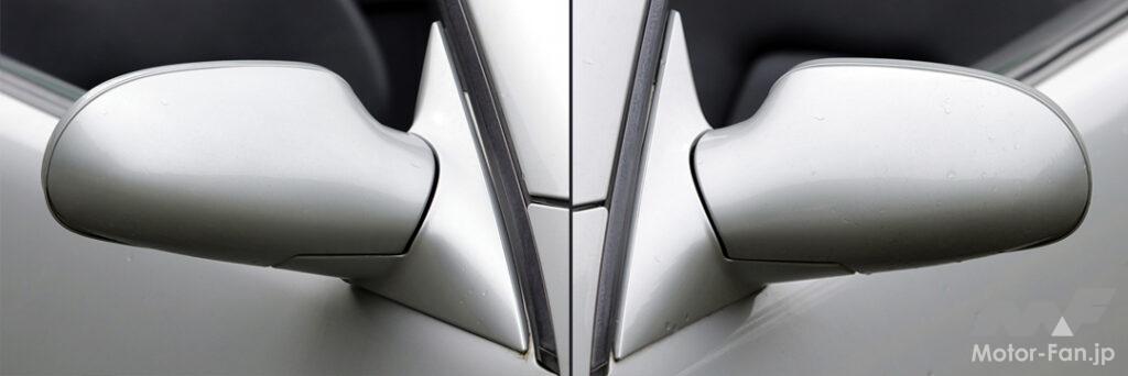 エクステリアの細部を見ていこう。まずはドアミラー。メルセデス・ベンツの多くにあった左右非対称のミラーは採用されていない。左右同じサイズである。次にドア、こちらは乗りやすいように、ボディに対して約90度と思われるほど大きく開く。だだし、なぜかサイドウインドウはドアに完全に収納がされない。ほんの少しだけ残ってしまうのだ。ドアの操作性、ドアハンドルは握りやすく、身体をサポートする形状で理想と思われる位置にある。パワーウインドウのスイッチはドアではなく、センターコンソールとなっている。