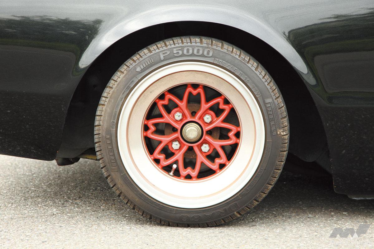 ホイールは拘りの弥生。サイズは前8Jオフセット‐11、後9Jオフセット-23の当時物。次はさらにワンサイズ太い弥生を履かせたいと話す
