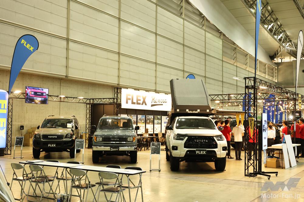 ここは主にハイエース、ランクル&プラド、ハイラックスの新車・中古車を専門に扱うFLEXのブース。他にラングラーを含むJEEP、FJクルーザーのほか、古いクルマにしゃれた独自デザインのパーツを施して新たな価値を据え付ける「Renoca」ブランド(「リノベーションカー(renovation car:修復車)に由来」も手掛けているが、一般にはランクルの中古専門店として知られているだろう。実際、過去ランクルがほしければFLEXで調べて手に入れたりするのが近道だ。