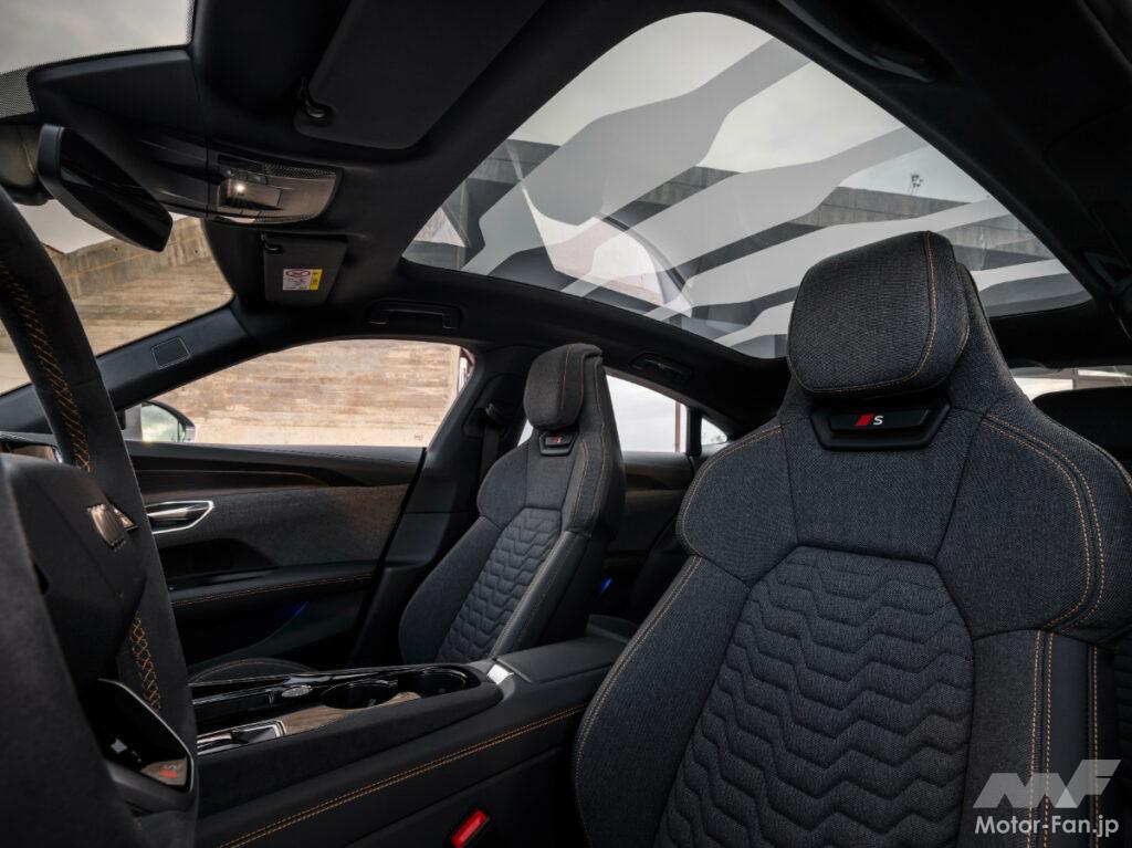新しいGTシリーズでは、ステアリングホイールの上下がフラット仕上げになっており、オプションで12時の位置にマーキングテープを付けることができる。シートもアップデートされ、ヘッドレスト下の開口部のデザインは、よりダイナミックになり、照明付きロゴを備えた一体型インレイが採用されている。S e-tron GTでは、14段階調整機能付きのスポーツシートプラスが標準装備されている。RSモデルの場合、オプションでマッサージ機能付きのシートを選択することができる。