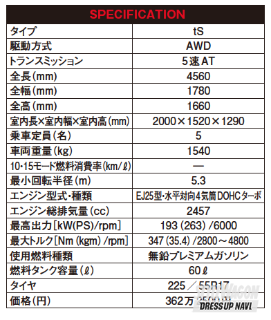 ベースとなったは、先のマイチェンを機に設定されたSエディション。インプレッサWRX STI A-Line譲りの2.5Lターボ+5速ATを搭載している。これにSTIチューンのダンパー&スプリング(フロントは倒立式)、フロントにフレキシブルタワーバー、サポート・フロント。リアにフレキシブルサポート・リア、そしてこれまではフロントに採用していたフレキシブルドロースティフナーを、今回初めてリアにも採用した。