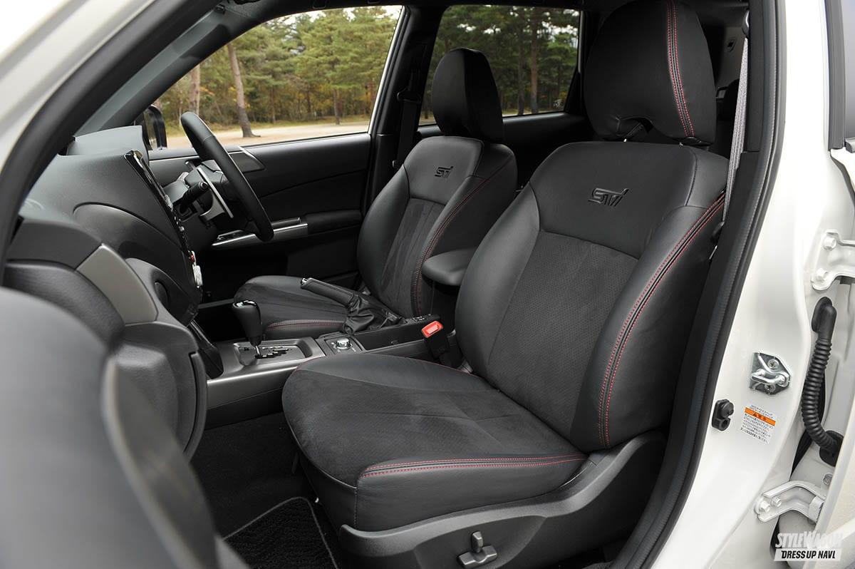 専用アルカンターラと本革のコンビネーションによるSTIロゴ入りのシートを用意。赤いステッチが施されグッとスポーティなイメージだ。