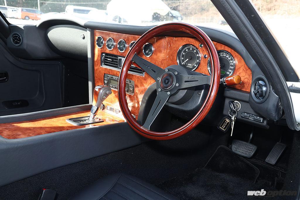 ブラックレザーと木目が美しいウッドのコントラストで仕上げられたインテリア。アナログタイプの7連メーターで旧車らしさを演出しながら、オートエアコンやフットペダル式のサイドブレーキ、パワーステアリング、ステアリングのチルト機構など最新装備との見事な融和を実現しているのだ。