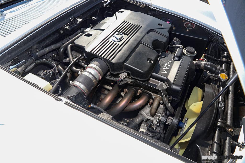 前ヒンジタイプのボンネットの下に搭載されているのは、3.0L・NAの2JZ-GE。オリジナルのMF10エンジンの1.5倍の排気量により、余裕のある走りを生み出している。新たにレクサスGS純正のエンジンカバーを追加して、見た目の完成度をさらに向上させている。
