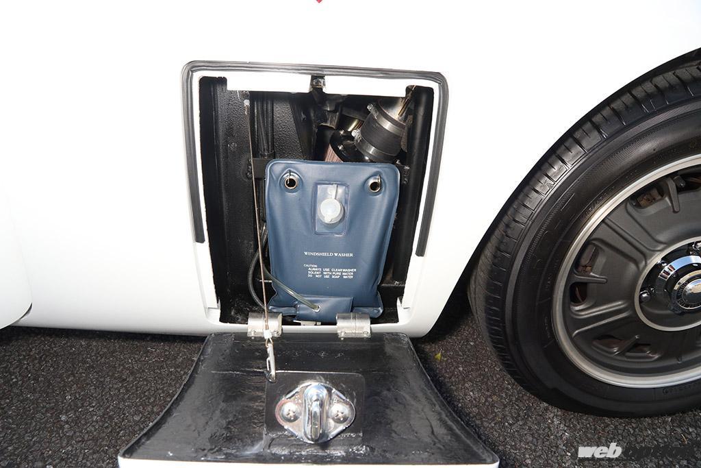 右フロントフェンダーのサービスホールに収まるのは、旧車ではお馴染みのカンガルーバッグタイプのウォッシャータンク。その奥にはスポーツタイプのエアクリーナーが確認できる。