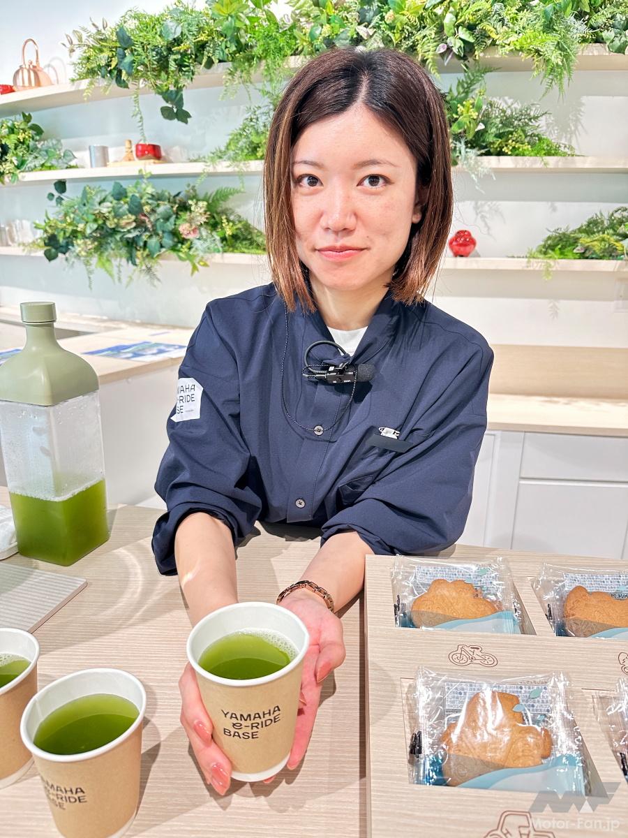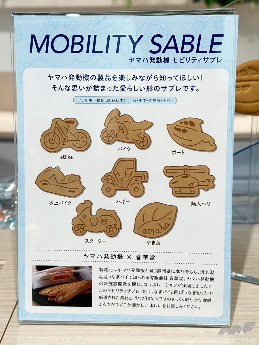 そこを抜けるとコミュニケーションエリアとなっており、ヤマハの電動アシスト自転車を生んだ静岡県森町特産のお茶を、ヤマハのモビリティ製品を象ったモビリティサブレとともに無料でいただける。このサブレは浜名湖名産うなぎパイで有名な「春華堂」が製造していて、うなぎパイと同じ「うなぎ粉」が入っている。