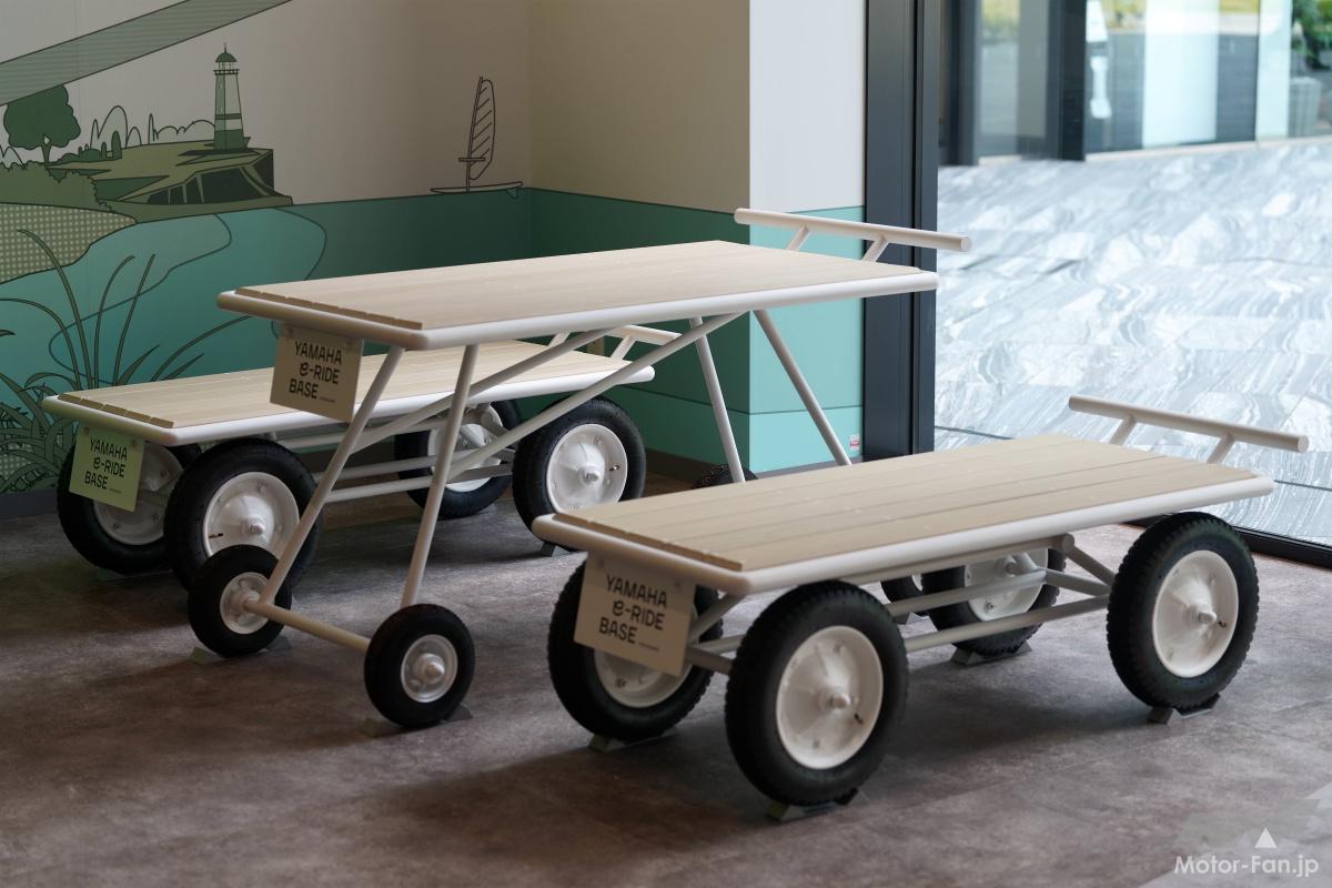 「私達(ヤマハ発動機)の製品は、バイクでもボートでも電動アシスト自転車でも、自然の中で使うものが多いということで、ウェルカムエリアでは風と光を見えるようにしてみました」とYAMAHA e-RIDE BASEマネージャーの橋本耕さんは教えてくれた。