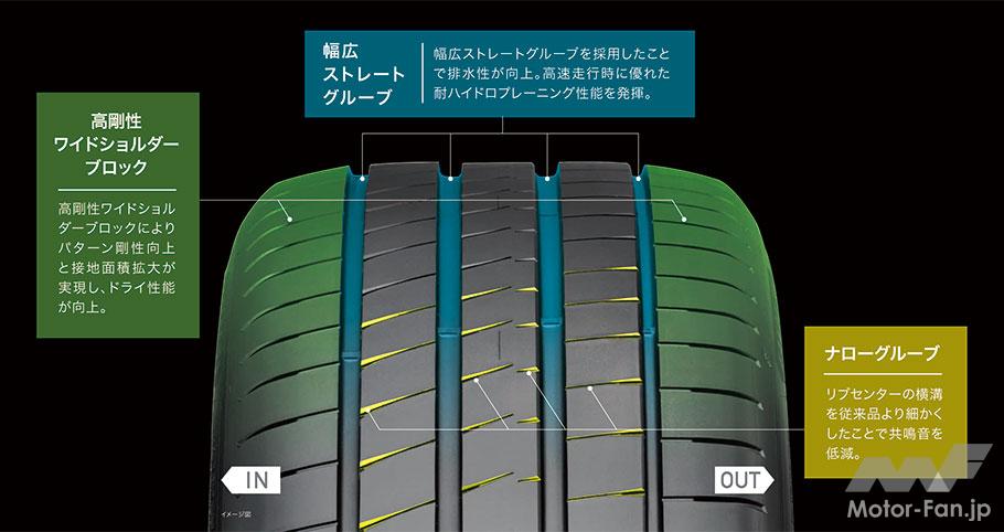 見た目の上では新旧差がないように思われたが、実際にはセンターに伸びる3本のリブに刻まれた横方向溝は旧モデルより細かく配列し、溝幅も狭くすることで音の発生を抑えたり、タイヤサイドの形状に丸みを持たせ、さらに10%程度の軽量化も行なっているという。ウルトラハイパフォーマンスタイヤでありながら、快適性能をも両立させた裏には、細部に到るまで妥協の無い繊細な作り込みが行なわれた結果だった。