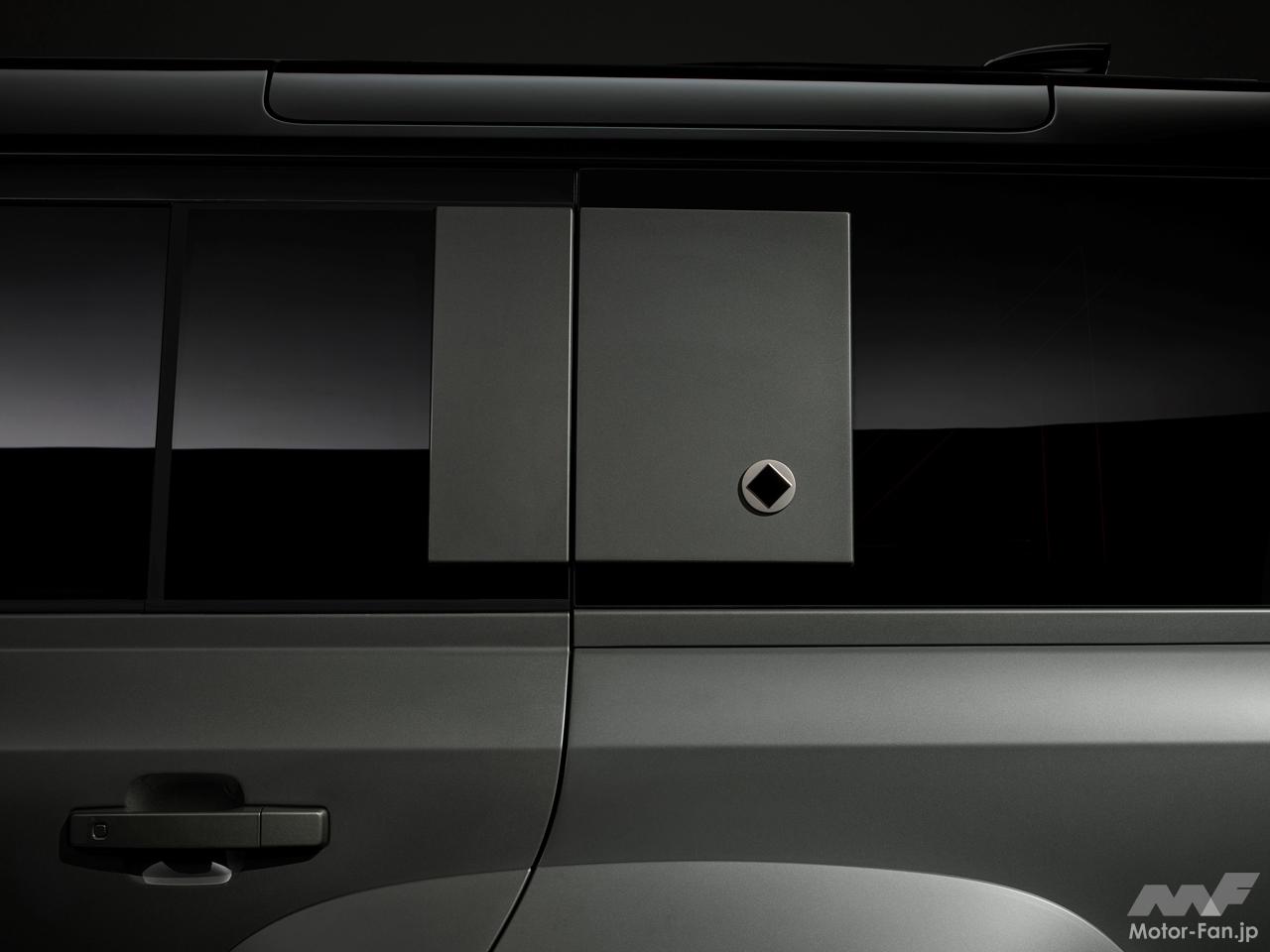 「ディフェンダー・オクタ」という名称は、地球上で最も硬く、最も人々を魅了する鉱物であり、特徴的な外観と耐久性を有する8面体(octahedron)形状のダイヤモンドに由来する。この形状からインスピレーションを得た「ディフェンダー・オクタ」は、強靭さや弾力性、人目を引く魅力、希少性や価値を象徴している。各シグネチャー・グラフィックパネルには、機械加工とサンドブラスト仕上げを施したチタニウムディスクにグロスブラックの菱形のロゴをはめ込んだ、新たな丸形のダイヤモンド型グラフィックをまとう。