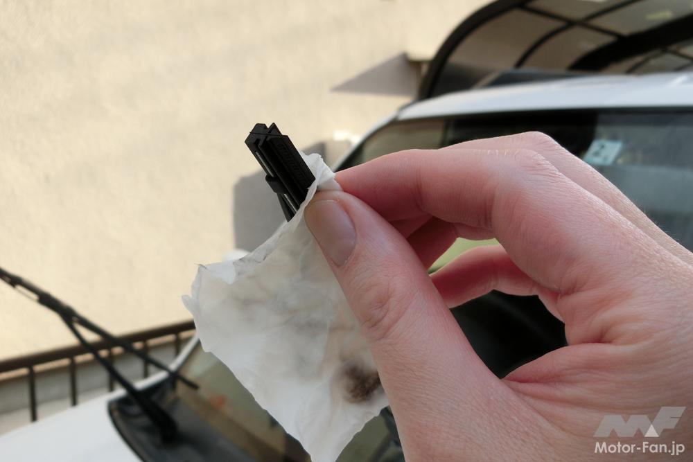 ゴム部分には、走行中、ガラスとの間に入り込んだ空気中のほこりやごみが想像以上に溜まっているものだ。春の時期の桜の花びら、秋の紅葉時の色づいた枯れ葉なんか、ワイパーを持ち上げた覚えなんかないのに、どうしたらこうなるのか、ガラスとゴムの間にうまく挟まっていることがある。