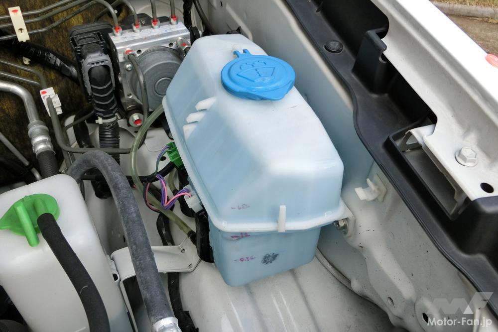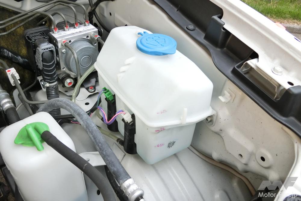 ガラスやワイパーの手入れをしたら、併せてフードも開き、ウォッシャー液の残量確認もしておきたい。