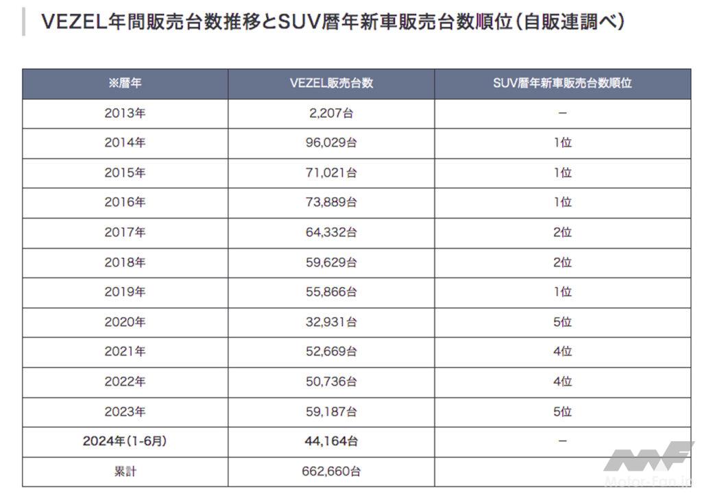ヴェゼルは、ジャンルの枠を超えた価値を高次元で融合したSUVとして2013年12月に発売されて以来、累計で66万台以上が販売され、多くの方々に愛用されている。