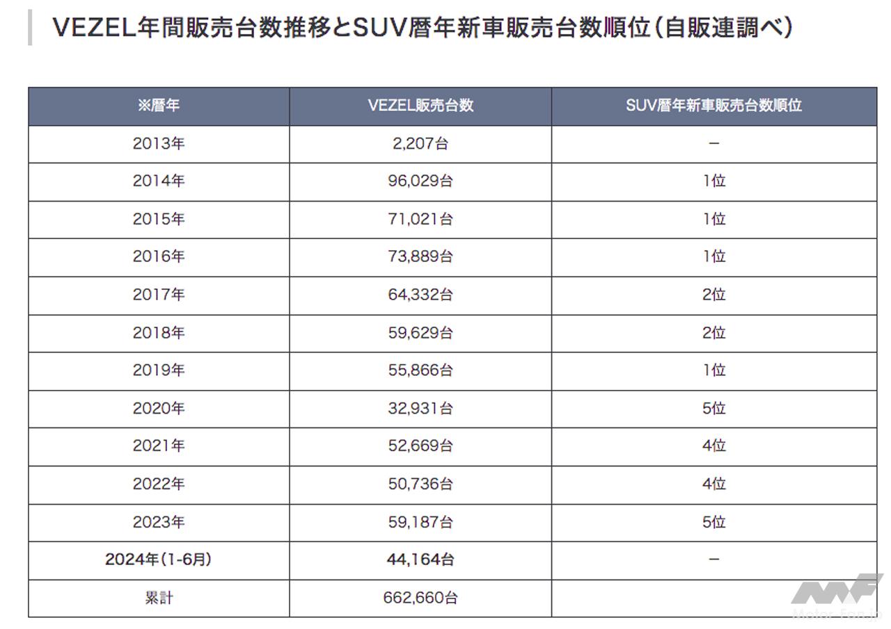 ヴェゼルは、ジャンルの枠を超えた価値を高次元で融合したSUVとして2013年12月に発売されて以来、累計で66万台以上が販売され、多くの方々に愛用されている。