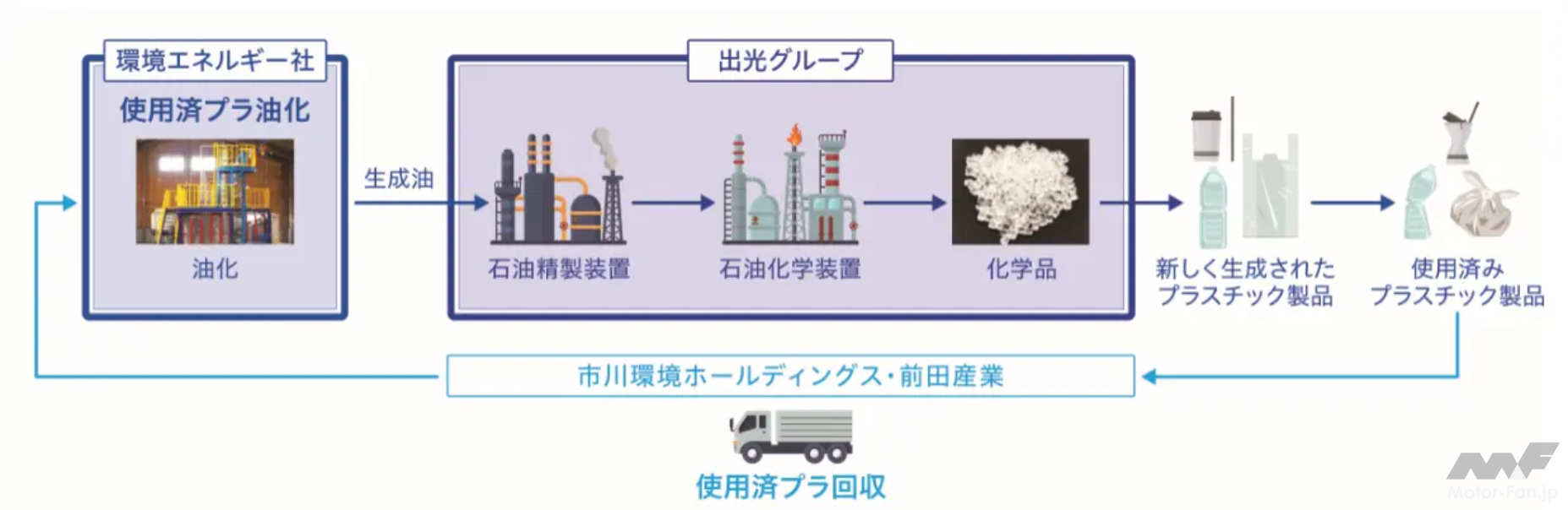 原料となる使用済みプラスチックの調達についても、首都圏・中部圏の大手リサイクラーである市川環境ホールディングス、前田産業と共同で調査が行われており、具体的な調達体制の構築に向け検討が開始されることが合意された。本事業化により、出光興産の既存設備を有効活用したプラスチックの資源循環生産システム(ケミカルリサイクル・システム)の構築が目指されるとともに、全国各地のグループ製油所での事業展開も検討される。