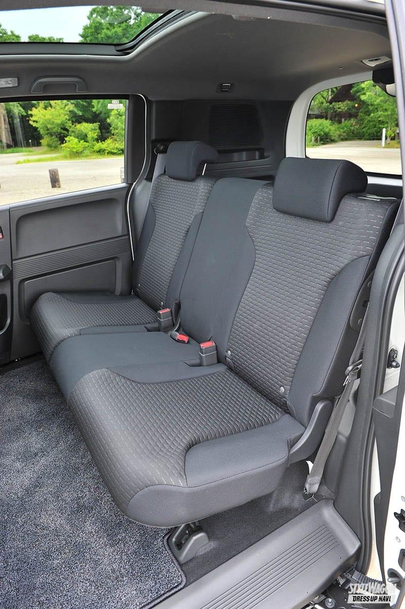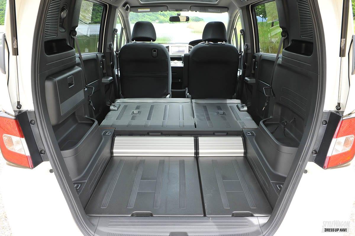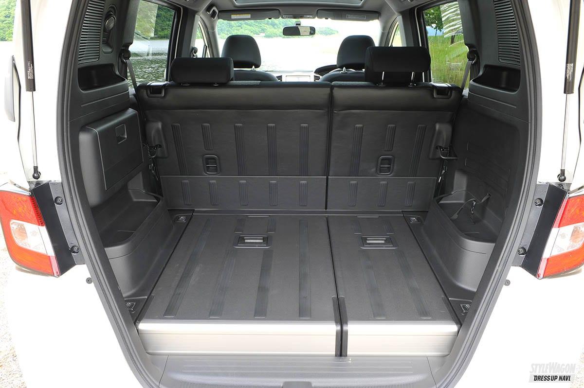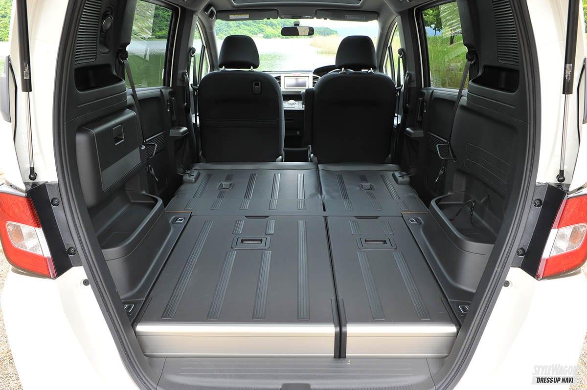 2列目シート~ラゲッジルームはスパイクならではの仕様が満載だ。まず2列目シートは収納方式がフリードとは異なり、シートバックを前倒しにすると座面も沈み込むダイブダウン式。これによりラゲッジに設置されている反転フロアボードと同じ高さとなり、広大なフラットスペースが出来上がる。
