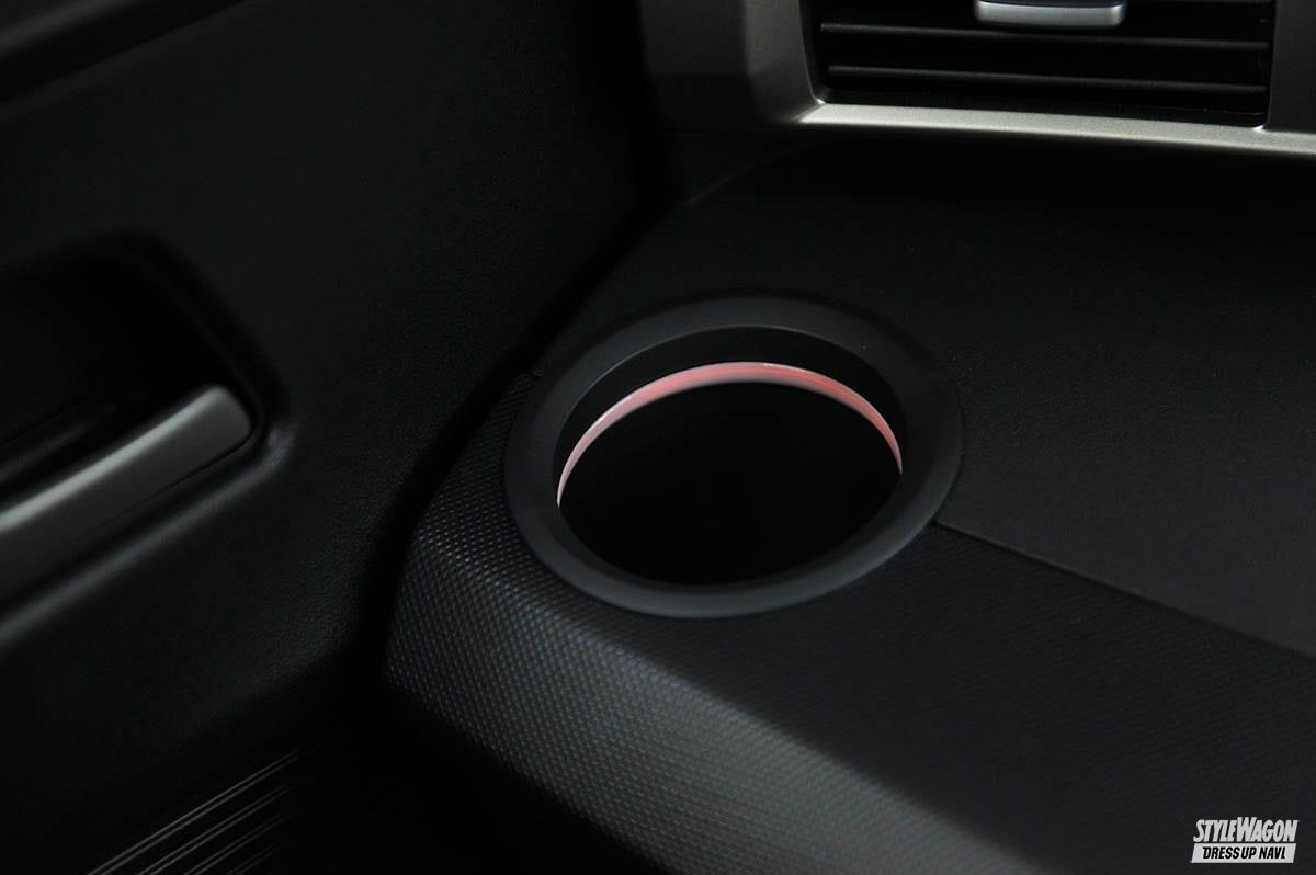 Gジャストセレクション以上のタイプに装着される運転席&助手席側のドリンクホルダーは照明付となる。