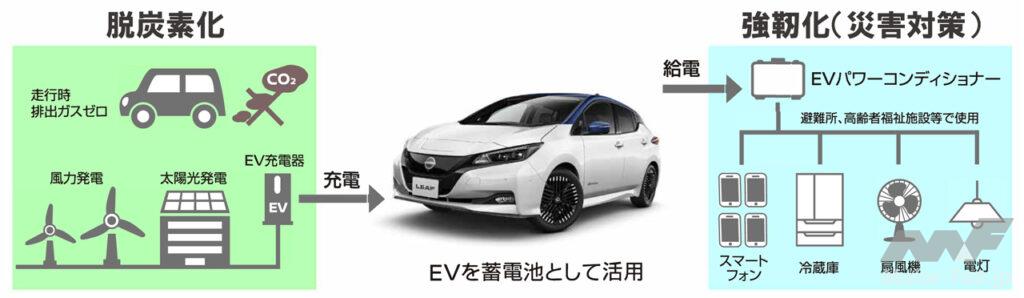 日産自動車は、これまで培ってきたEVに関するノウハウやネットワークを活かし、エネルギーマネジメント、サーキュラーエコノミー、サステナブルツーリズム、地域交通、次世代教育を通じ、脱炭素化、強靭化(災害対策)の実現により社会変革を促す日本電動化アクション「ブルー・スイッチ」を、国内の販売会社とともに推進している。EVの普及によるゼロ・エミッション社会構築を目指し、SDGsの達成や地域社会の発展に貢献するため、全国の自治体や企業と連携している。