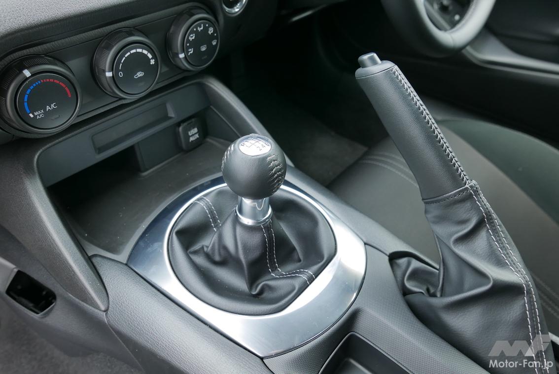 である。現行ロードスター(6MT)の走りは、この6速=1.000(直結)というのが大きな特徴になっている。このギヤ比のおかげで、1から6速まで街中でも使いこなせるのだ。変速操作が楽しいのは、NAもNDも同じだ。