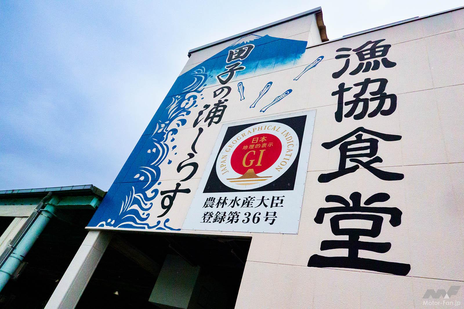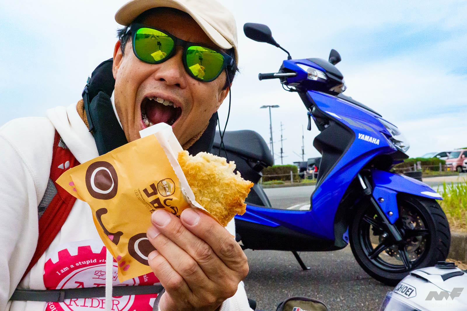 田子の浦漁協にシグナスXをとめ、食い物を物色。この漁協食堂には、絶品のほまれ高い魚類の丼がいくつかあるらしい。だがあまりの大人気で、すでにズラズラ客が並んでいて待つのが面倒くさくなり、すぐ買えるコロッケで手っ取り早く済ませることにした。