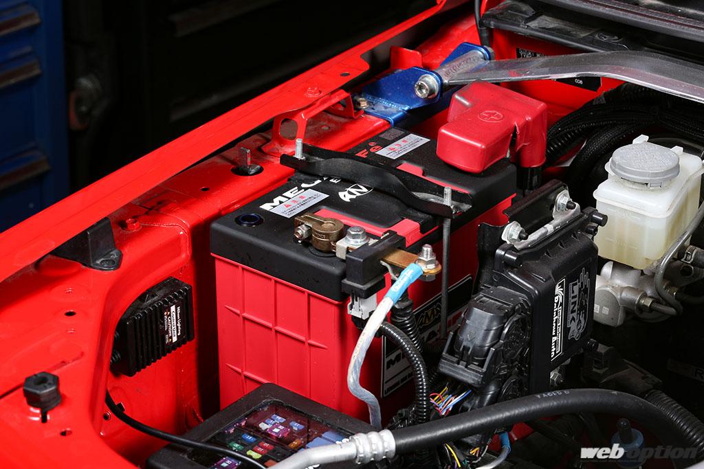 バッテリーには、一般的な鉛バッテリーの4〜5倍という耐久性に加え、高い放電性能による高出力、安全性といった特徴を持つメガライフバッテリーを搭載。性能はもちろん、純正の鉛バッテリーに比べて1/2の重量なので、運動性能の向上も期待できる。レインボーオートの常連達の間では定番になりつつあるアイテムとのこと。