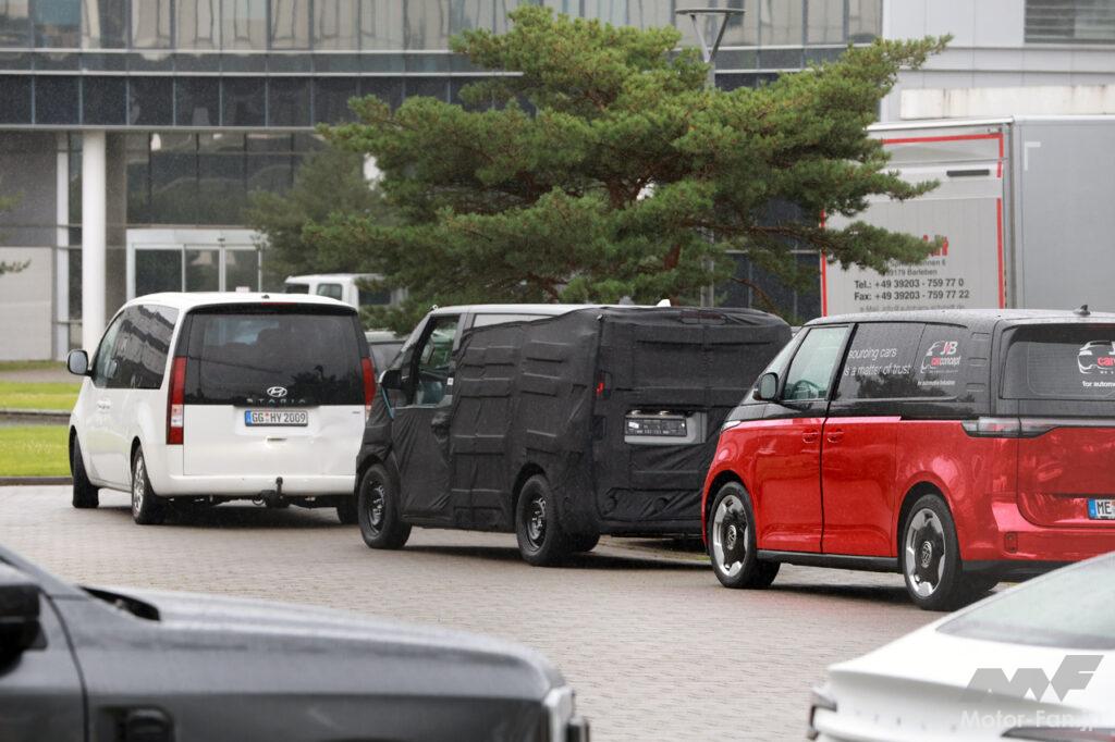 フォルクスワーゲン(以下VW) ID.Buzzとヒョンデ ステーリアを伴ってあらわれた謎のプロトタイプカーは、フルカモフラージュされてはいるが、どう見ても箱型のスタイリングは何の変哲もない商用バンのように見える。しかし、覆われていないサイドウィンドウをよく見ると、実はこれがPV5であり、最終生産ボディを装着している可能性が高いことがわかるのだ。