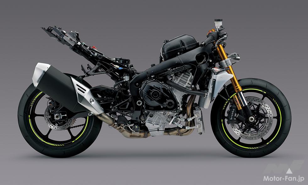 強さと軽さを両立したモノバックボーンフレーム、ショーワ製SFF-BP倒立フロントフォーク、軽快な片持ち式のプロアーム型スイングアーム、TOKICO製ラジアルマウント式4ポッドキャリパー採用のフロントブレーキ、前後輪のロックを回避するABSなど、フレームや足周りも非常に豪華。