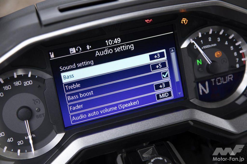 直ぐには覚えられない程多機能な液晶ディスプレイ。写真はオーディオの設定画面。ハンドル左側スイッチやメーター中央手前のインターフェイスダイヤルで操作できる。