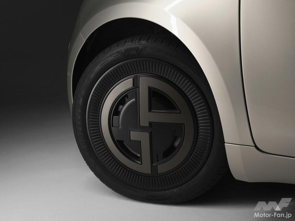 この限定車にはジョルジオ・アルマーニのスタイルと趣味が反映された“ダークグリーンミシナライズド”と“セラミックグレージュ”の2つの特別色が設定され、外装デザインでは、コントラストや装飾を減らし、アルマーニのスタイルに合わせたモノクロ効果が目指されている。特に目を引くのは、“GA”のロゴを大きく表現したホイールで、空力性能も向上させている。