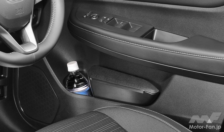 また、『NZ887K WR-V専用 ゴミ箱 運転席用』は、ドアポケットにピタリと合う形状で、元々ドアに設けられているボトルホルダーのスペースも塞がない。フタ部分はWR-Vの内装に合わせた革シボが施されており、自然にインテリアになじむ。一定以上開けると開いたままの状態になるクリック構造を採用し、片手操作でのゴミ捨てが可能だ。走行中の振動音やフタを閉める際の衝撃を軽減するため、スポンジ素材も使われている。