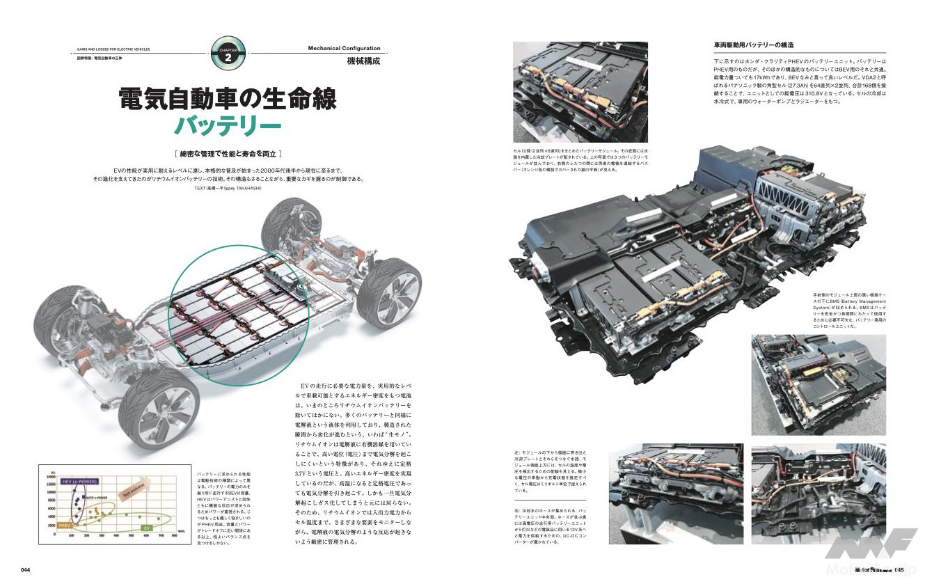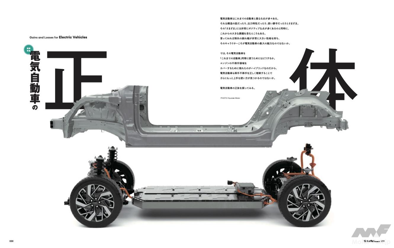 一方で、エンジン+変速機構成の従来車に比べてシンプルな機械構成についても詳解。とくに日産・アリアで登場した「磁石を使わないモーター」とはどのような特質があるのか、電気自動車の生命線ともいえるバッテリーを有効活用するにはどのような構造や使い方がいいのかなどを図解しています。