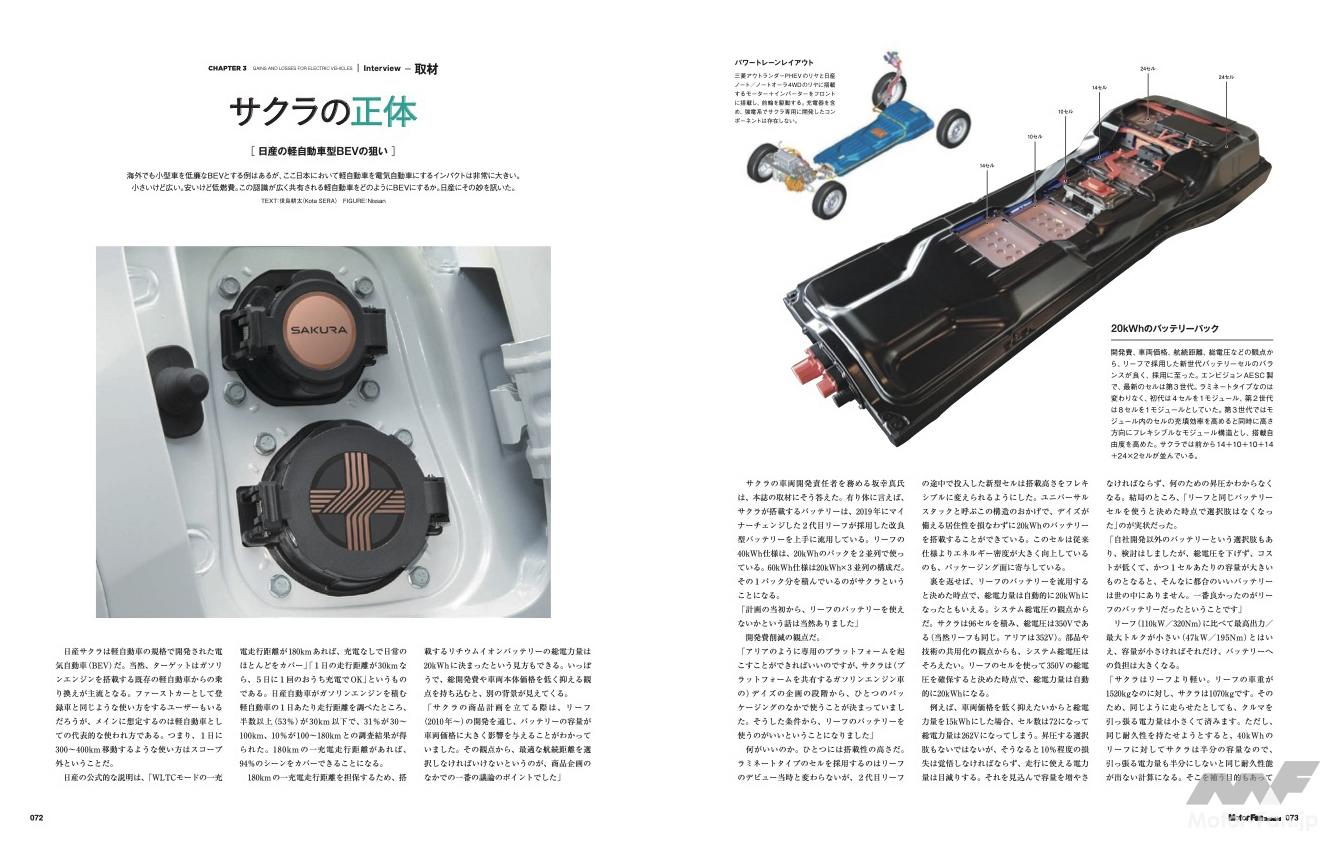 Chapter 3は市販BEVの紹介です。2022年9月現在、日本で購入できる電気自動車はそれぞれどのような特質があるのか。外国車を含めてカタログ形式としました。さらに日産には、一番小さい/一番大きい電気自動車2種、サクラとアリアについて開発陣に取材。電気自動車というプロダクトを日産がどのように考え、開発し、生産しているのかを訊きました。世界で一番小さい電気自動車といって差し支えないサクラは、小さく軽く、そして買いやすくするための工夫が各所に凝らされています。