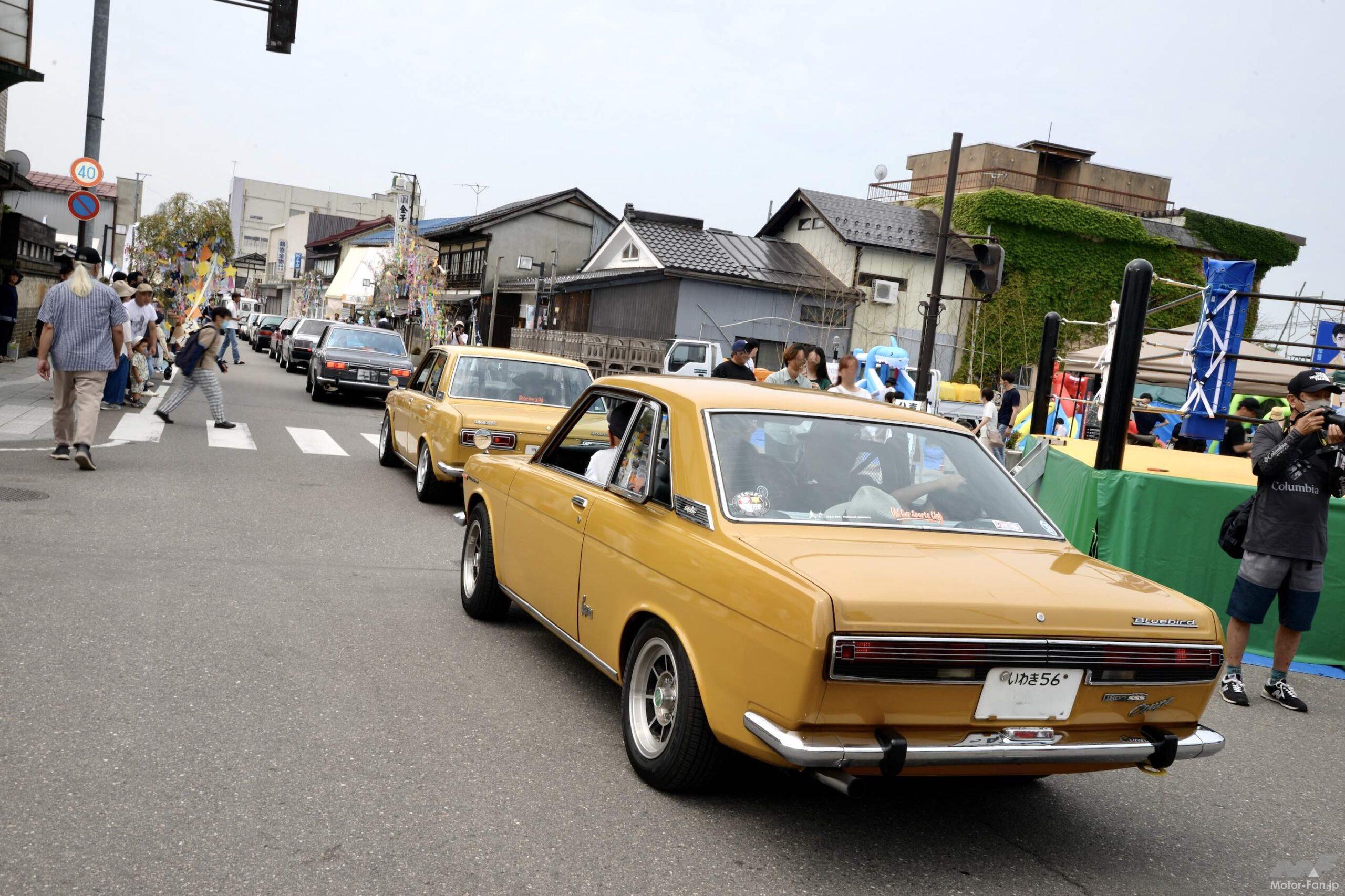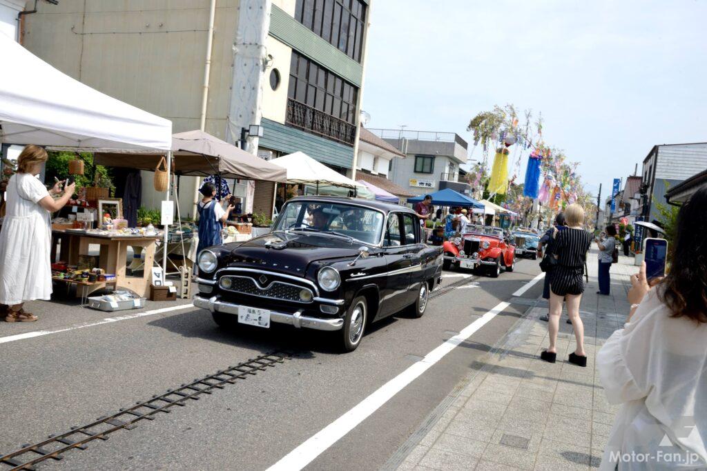 レトロモーターShowは歩行者天国と化したレトロ横丁へ古いクルマたちがゆっくりとパレードすることから始まる。沿道にはカメラやスマホを片手にした見学客が大勢並び、色とりどりのクルマたちを撮影している。このパレードは午前9時過ぎから開催されるので、来年見に行くのであれば早めに会場へ足を運ぶことをお勧めする。