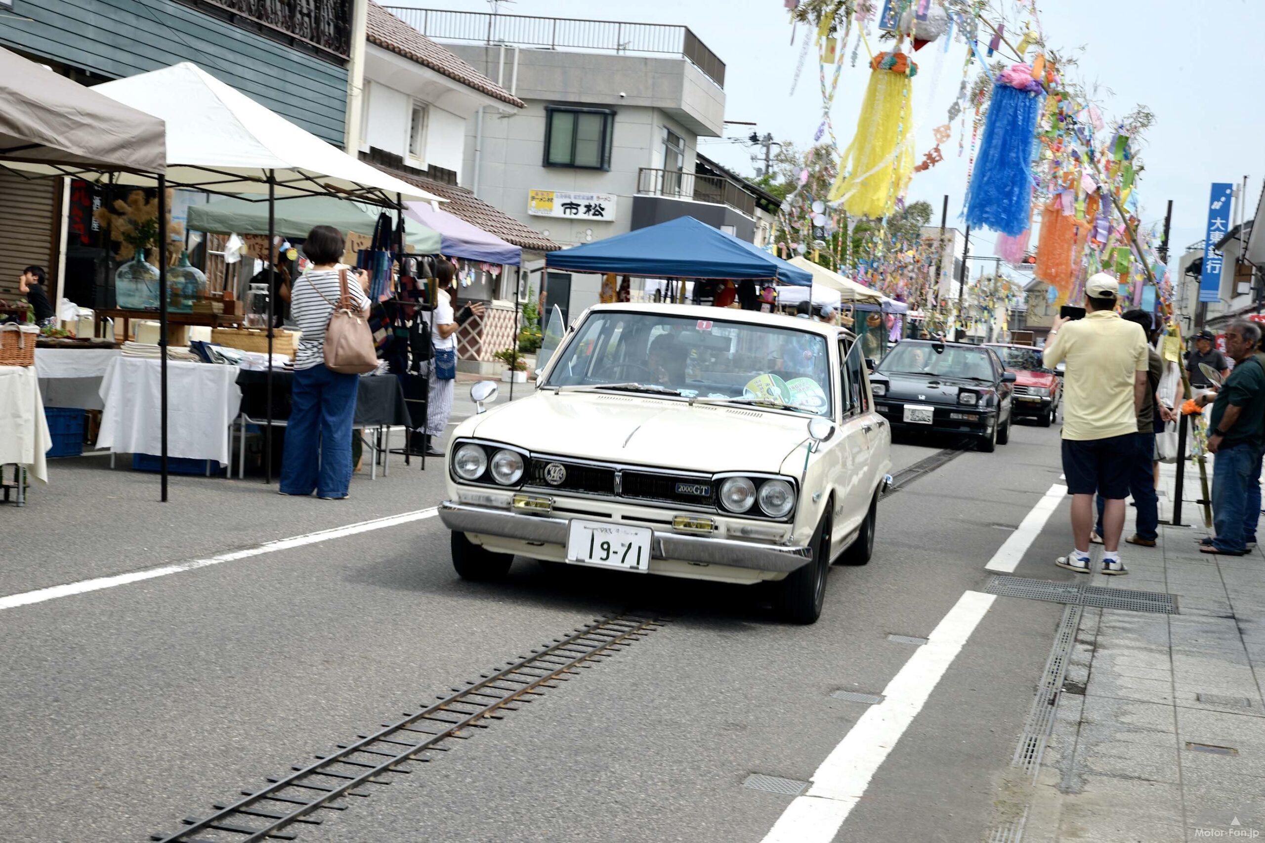 パレードを終えたクルマたちは歩行者天国となった商店街の西端から順に整列する。主催側によればパレードの順番はできるだけ同じ車種やクラブ単位であることを優先しているそうで、整列した後も同じ車種やクラブの車両がまとまって並ぶことになる。エントリー順だったり会場へ到着した順ではなく、見る側・参加する側ともに楽しめるよう工夫されているのだ。