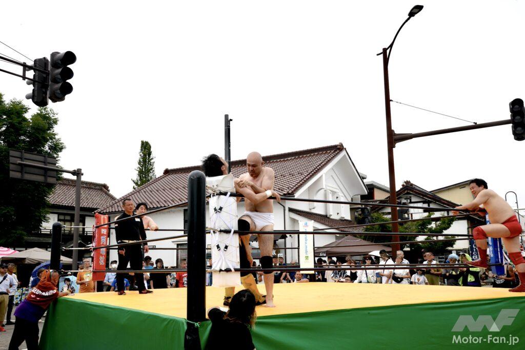 レトロモーターShowのパレードが終わると商店街はさらなる活気に湧く。大道芸が始まるだけでなく農機具用の発動機が運転を始め、ミニ機関車が走り出す。さらには誰でも参加できるカラオケの「のど自慢」や「激闘! 青空プロレス」も始まり、どこを歩いていても楽しめること間違いなし。単なる旧車イベントだけでもクルマ好きなら楽しめるが、こうして夏祭りを同時に開催される場合なら家族や子供たちを連れて行くこともできる。それでは以降、パレードの様子など写真を中心にお届けしよう。