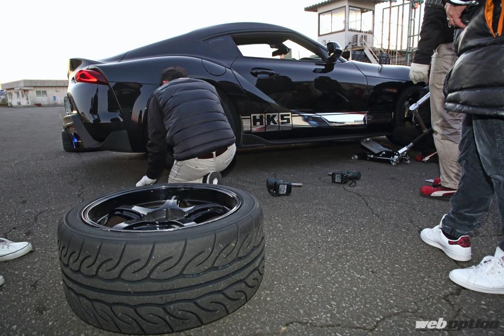 アタック車両は、HKSが所有する開発車両のGRスープラ(試乗企画でレンタル中)。タイヤサイズはフロント255/35-19のリヤ275/35-19とし、条件を揃えるためにホイールもウェッズスポーツRN-05Mで統一した。