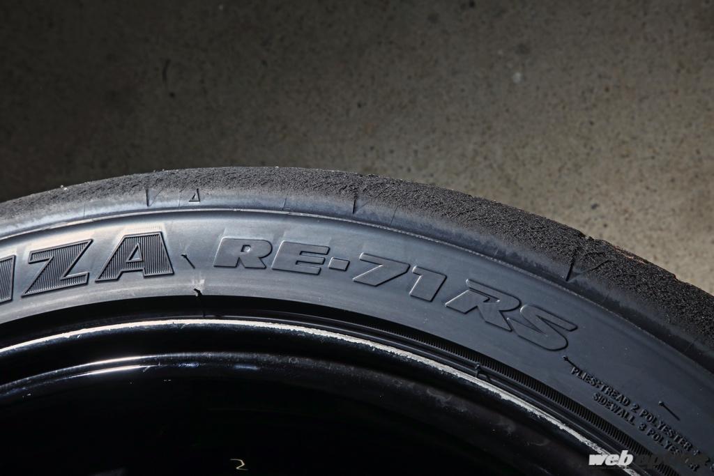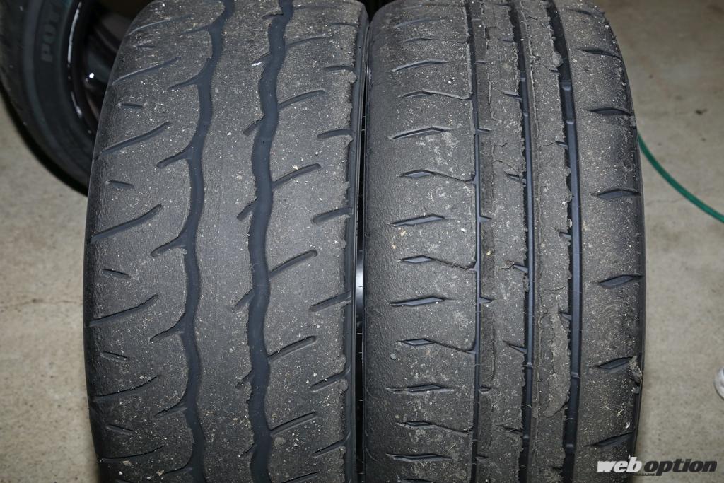 しかし、ここで「ポテンザRE-71RSの勝利」と考えるのは短絡的だ。というのも、走行後にそれぞれのタイヤのトレッド面を確認したところ、大きな違いがあったからだ。