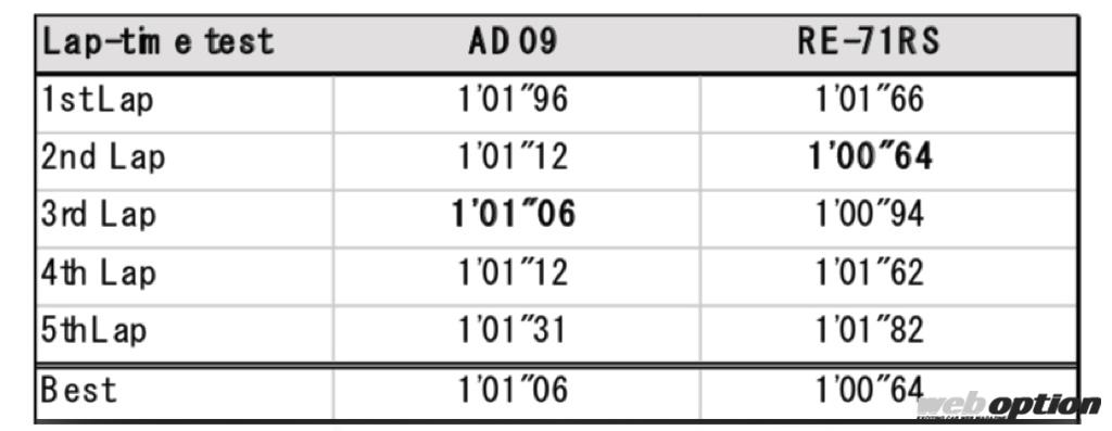 また、ラップタイム表を見ると、前半はRE-71RSが圧巻のパフォーマンスを見せつけているが、後半でタイムが逆転。アベレージタイムでは、アドバンネオバAD09=1分1秒314/RE-71RS=1分1秒336と、アドバンネオバAD09に軍配が上がっているのだ。