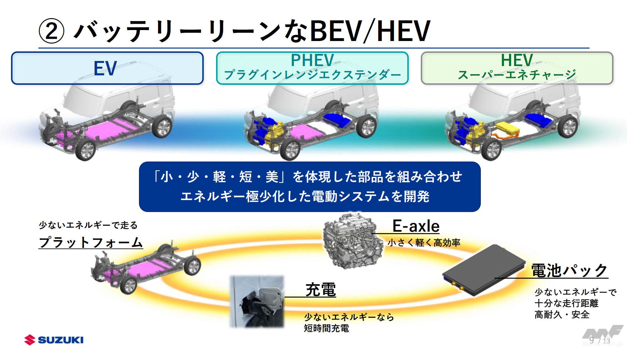 スズキは2025年以降、市場に順次BEVを展開していくが、電動パワートレイン搭載車においてもエネルギーの極少化を推進。