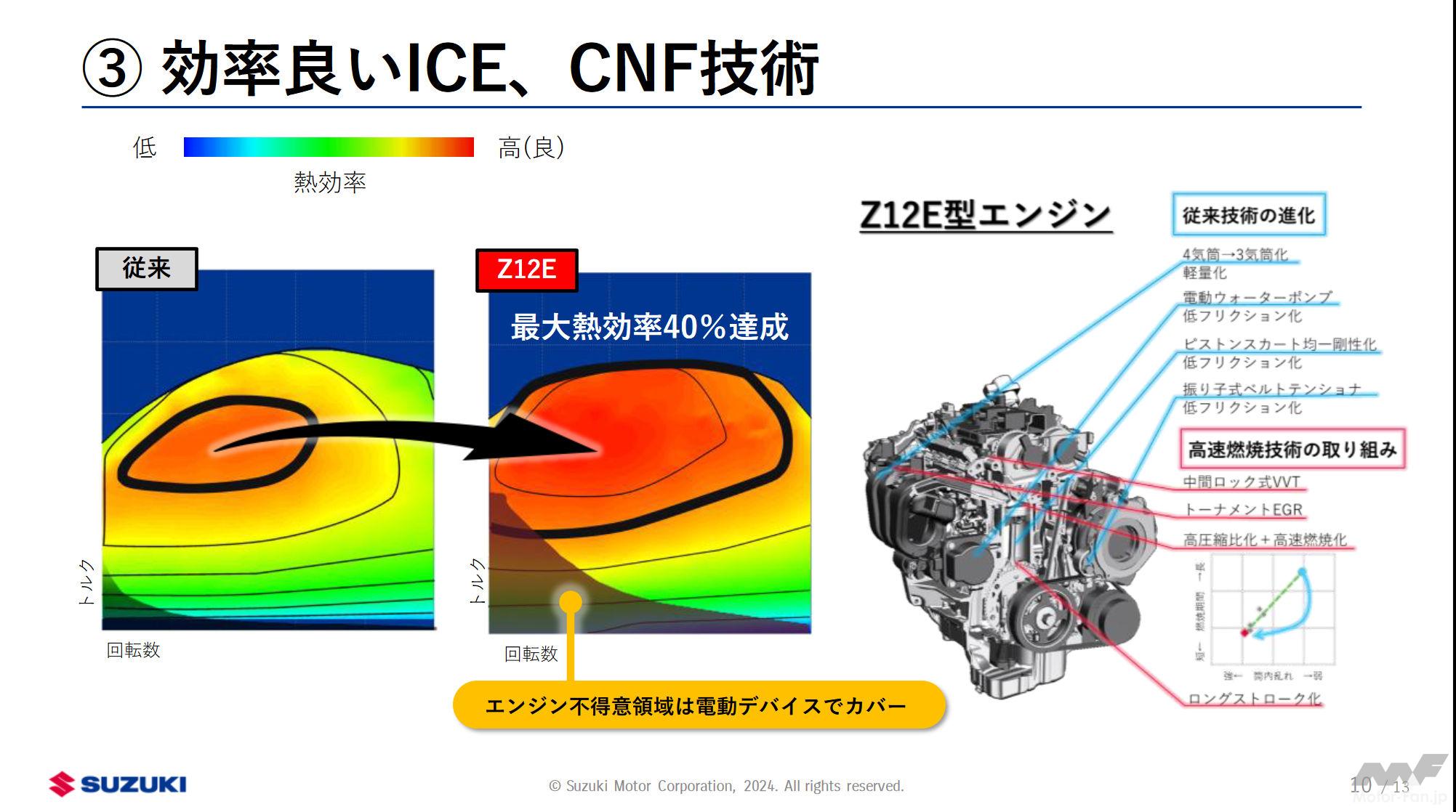 スズキは2023年、Z12E型エンジンをスイフト搭載。燃焼を追求して開発されたこのエンジンは最大熱効率40%を達成した。今後はこの高効率エンジンの技術を軽自動車から小型車に広く展開していく。