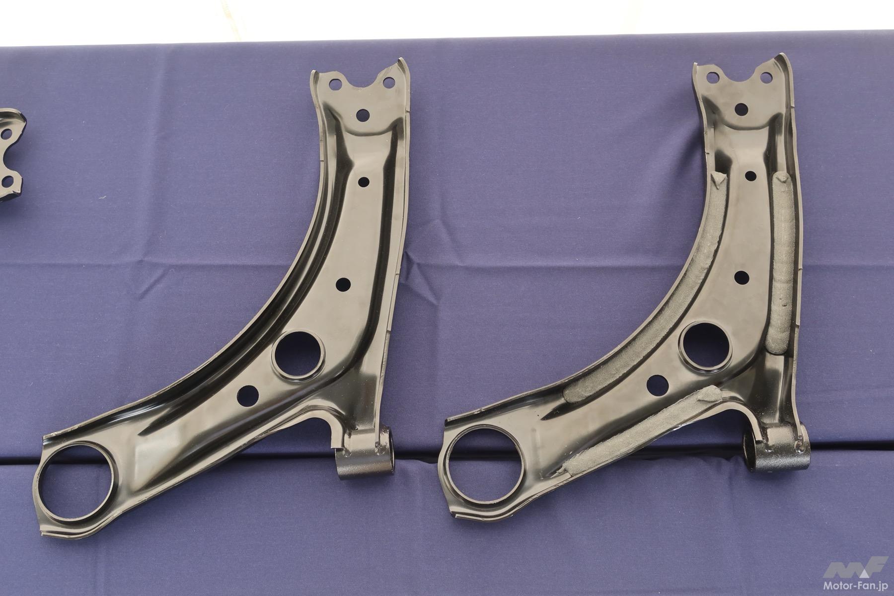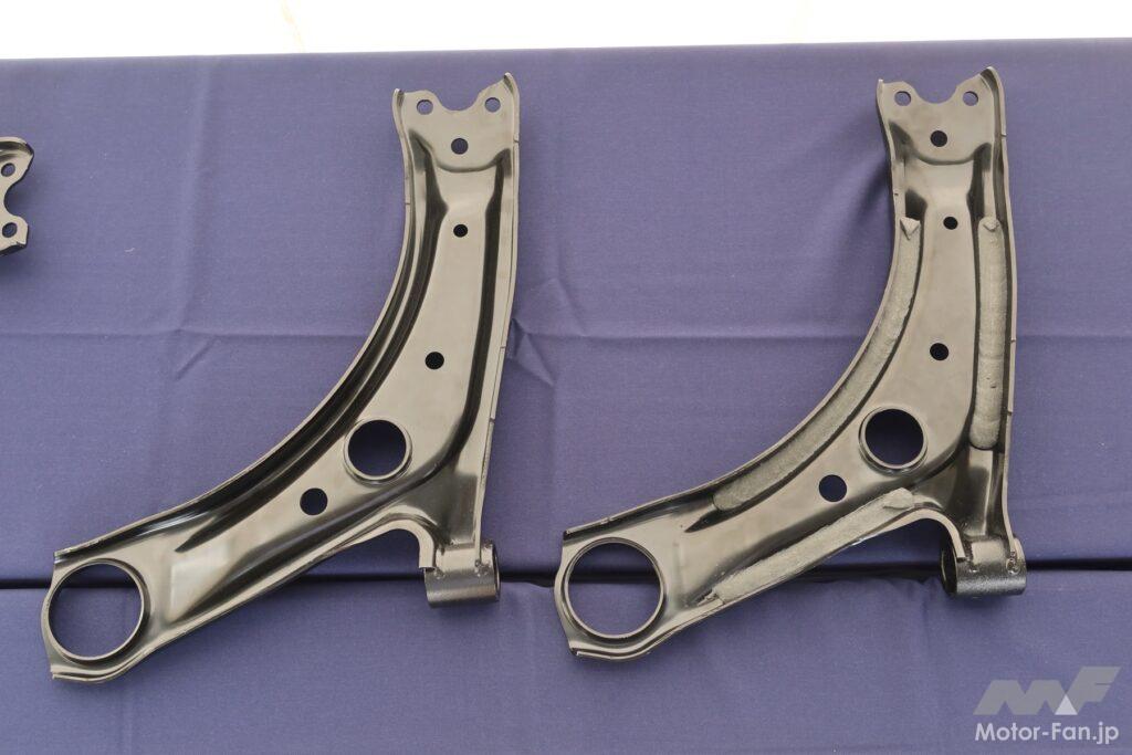 技術的なハイライトのひとつは、塗布型剛性アップ材のREDS(Response-Enhancing Damping Structure)だ。フロントのロワーアームに熱硬化性樹脂を塗布することで断面変形を抑制。1.5倍の剛性アップを図るにより、ベース車に対して操舵応答性を高めている。鉄板を溶接するなどの従来技術で剛性向上を図るより重量増は小さくて済むし、振動減衰の効果で乗り味が上質になる副次的な効果も得ることができたという。