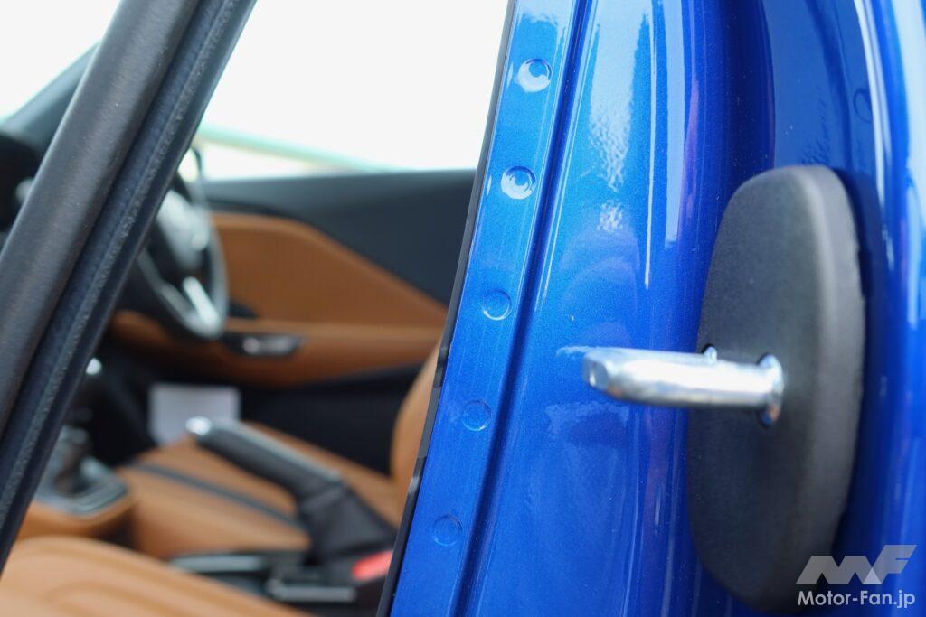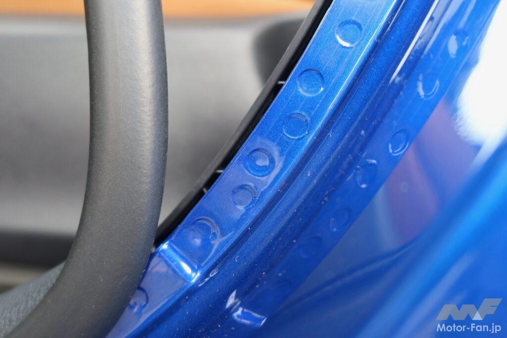 スペック表上の全高の違いは10mmだが、ルーフの最高点で比較すれば、MORIZO RRはベースのLBXに対して25mm低くなっているという。スペック表での違いが10mmに留まっているのは、MORIZO RRがシャークフィン型のルーフアンテナを装着しているからだ。ベース車はルーフアンテナを搭載していない。機械式立体駐車場の利用を考慮して全高を1550mm以下に抑えるため、日本仕様のみアンテナ機能をスポイラーの中などに分散して配置しているからだ。