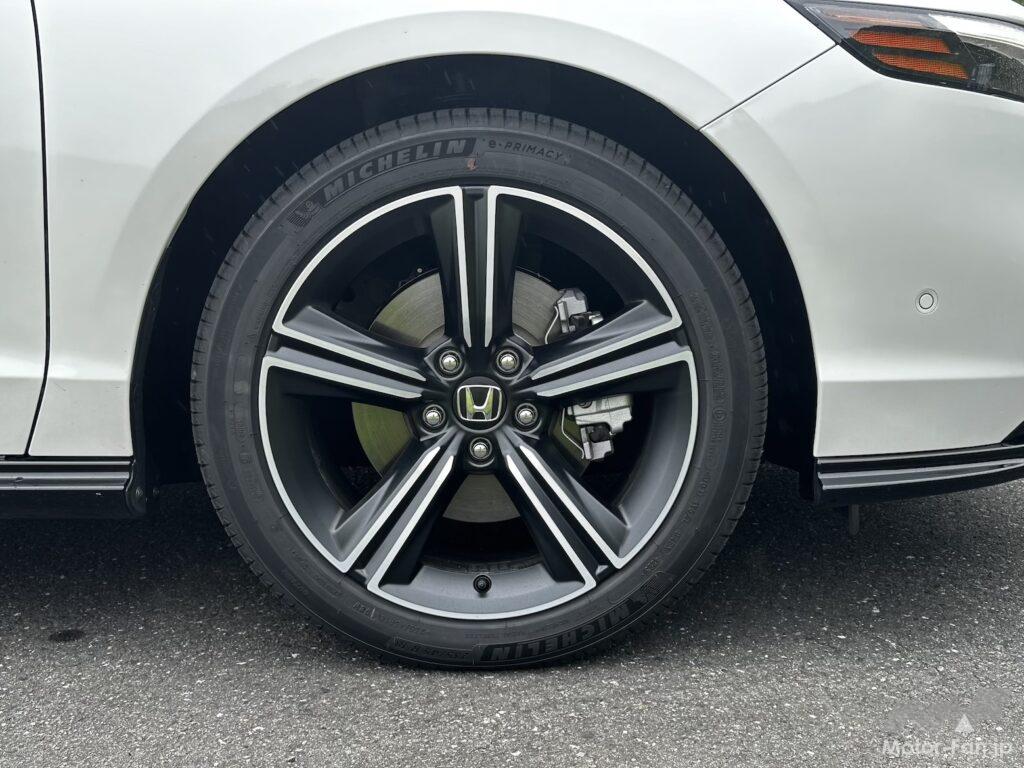 ホンダ・アコード e:HEV 全長×全幅×全高:4975mm×1860mm×1450mm ホイールベース:2830mm 車重:1580kg サスペンション:Fマクファーソンストラット式/R マルチリンク式 駆動方式:FWD エンジン 形式:直列4気筒DOHC 型式:LFD 排気量:1993cc ボア×ストローク:81.0mm×96.7mm 圧縮比:13.9 最高出力:147ps(108kW)/6100rpm 最大トルク:182Nm/4500rpm 燃料供給:DI 燃料:レギュラー 燃料タンク:48L モーター H6型交流同期モーター 最高出力:184ps(135kW)/5000-8000rpm 最大トルク:335Nm/0-2000rpm WLTCモード燃費:23.8km/L 市街地モード 20.5km/L 郊外モード 27.0km/L 高速道路モード 23.6km/L 車両価格:544万9400円