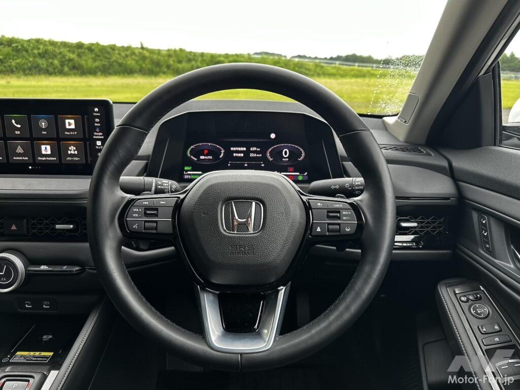 走り出すと、パワートレーンの洗練度の高さに驚く。静か、滑らか。e:HEVはかつてi-MMDと呼ばれていたホンダ独自のハイブリッドシステムだ。基本はシリーズハイブリッドでモーター駆動だ。高速巡航になればエンジン直結となり、その中間はエンジン/モーターアシストとなる。とはいえ、エンジンがかかってもがっかりすることはない。静かで滑らかだ。