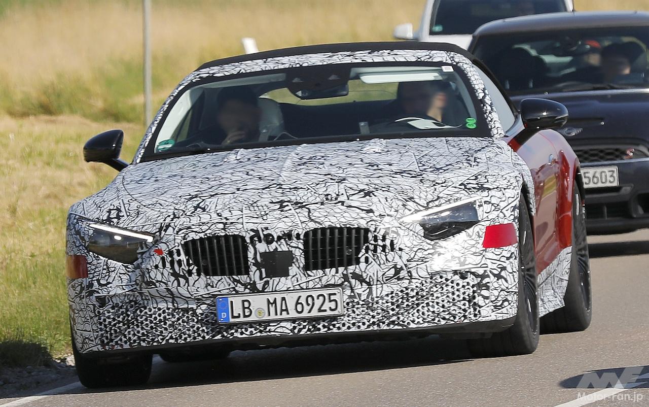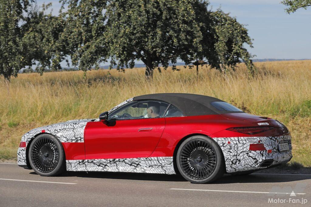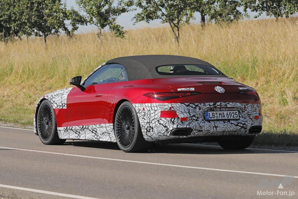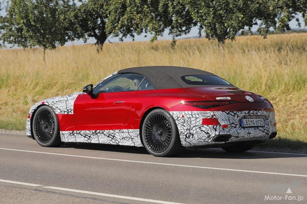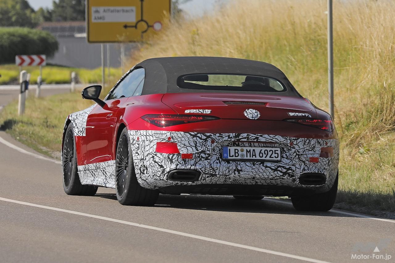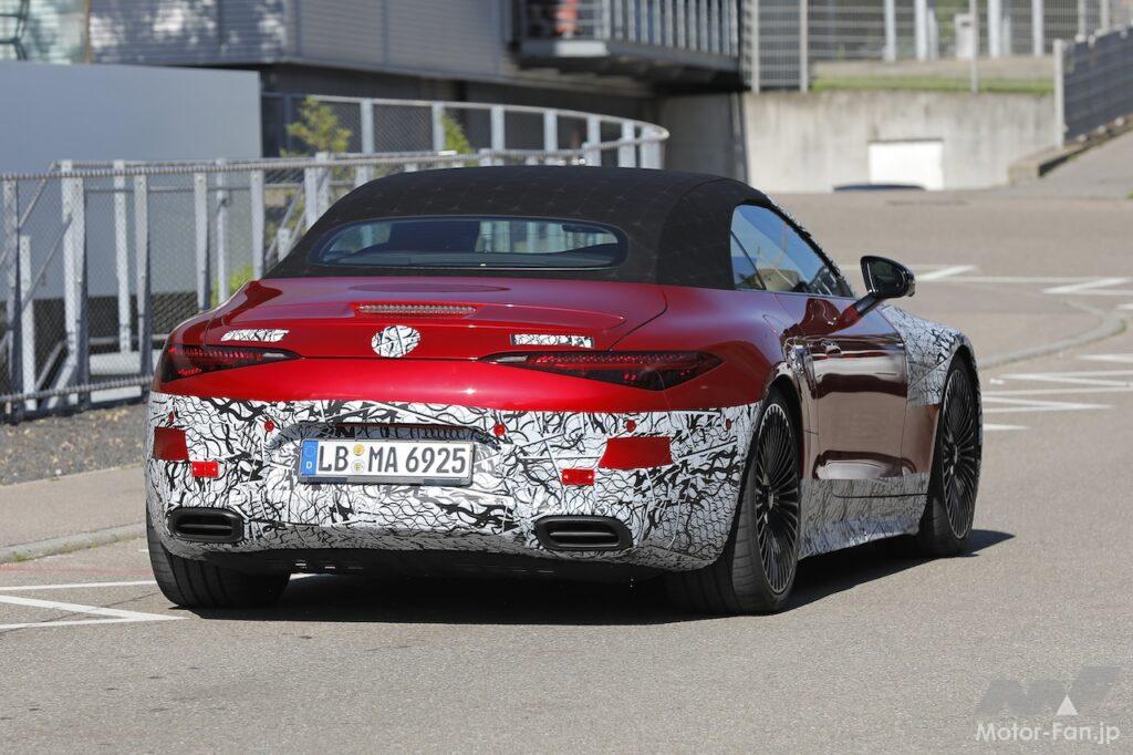 後部に目を移すと、トランクリッドに配置されるブランドロゴがテープで隠されており、新デザインのバンパーが装備されている。通常、直列4気筒版のSLには円形の、V8版(フラッグシップのEパフォーマンスハイブリッドを含む)には、四角いクワッドエキゾーストパイプが装備されるが、このプロトタイプには、楕円形のデュアルエキゾーストパイプがインストールされている。
