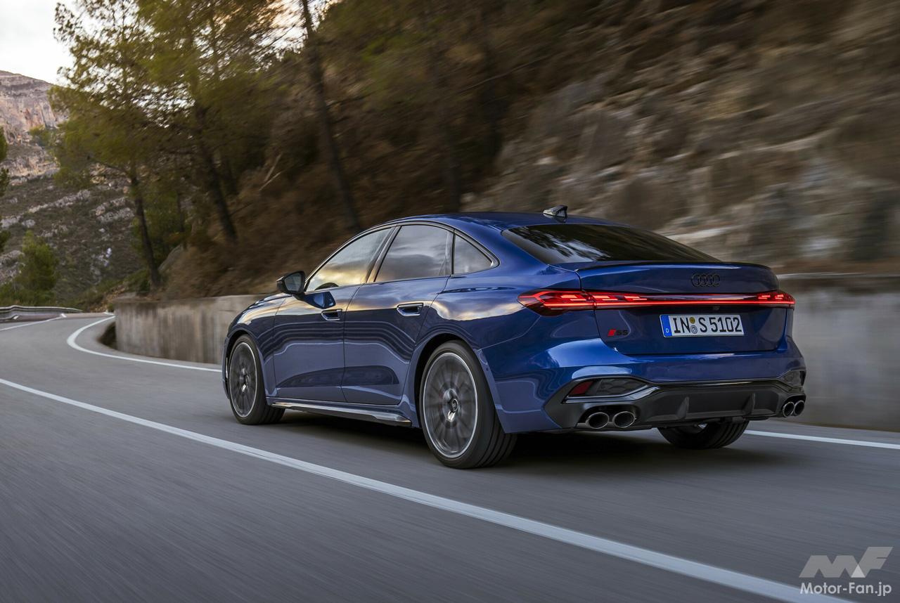 高性能版の「S5」には、270 kW(367 ps)を発揮する3.0LのV6 TFSIエンジンを搭載。初めて可変タービンジオメトリー(VTG)付きターボチャージャーとMHEV plusテクノロジーが備わる。S5のアップデートされたDCT(Sトロニック)は、より高いトルクに対応できるように設計されており、フロントアクスルの重量を減らし、軽快感を高める。新しい48VのMHEV plusシステムによる部分的な電動化は、電動ドライブコンポーネントと高い回生性能によるCO2排出量の削減をもたらす。先代のS4 TDIと比較して、新型S5 TFSIは、最大14g/kmのCO2排出量を削減。