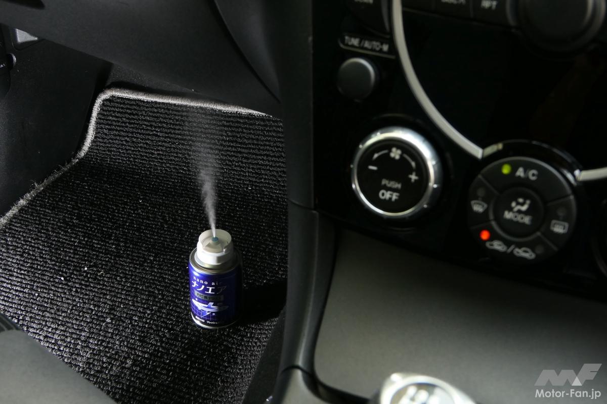 エアコンを使用していない時もカビ臭が漂ってくるようなら、シートやフロアマットにも雑菌が繁殖している恐れがある。車内空間を丸ごと除菌、消臭できる拡散タイプがオススメ。エアコン内部やシート、フロアマットなど繊維の奥まで消臭成分が浸透し、不快なニオイを絶つことができる。