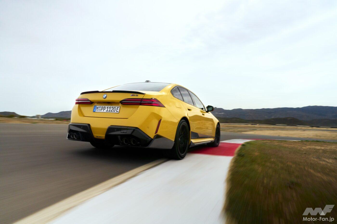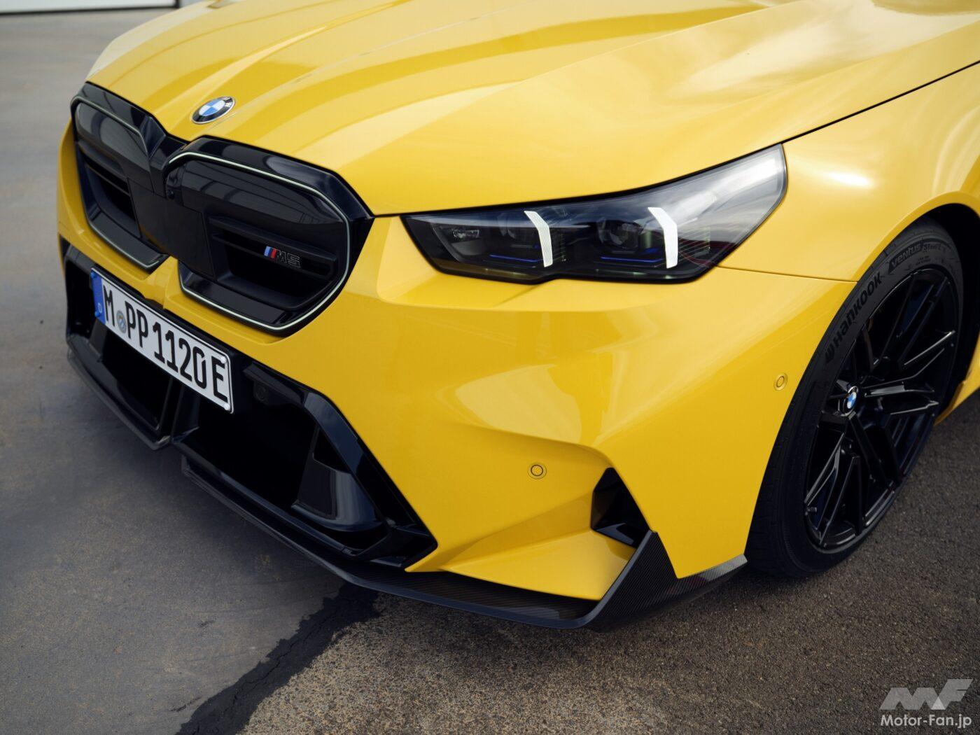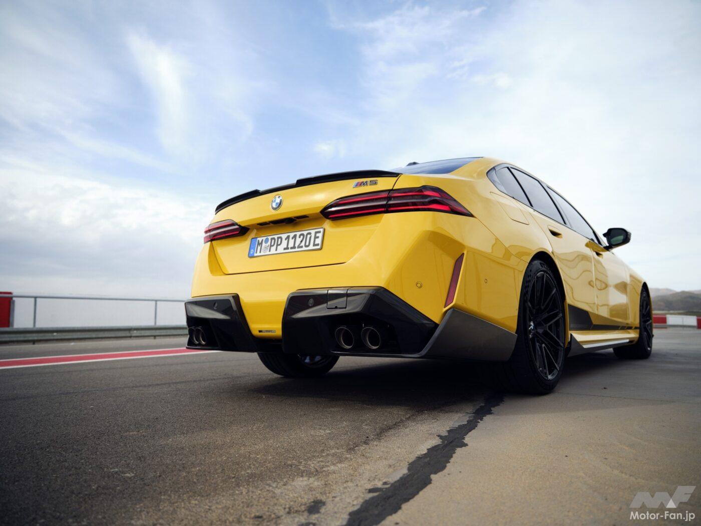 ワイドトレッドとボディサイドフレームの特注デザインにより、新型M5は筋肉質なプロポーションを実現している。カーボンファイバー製のMパフォーマンス・シルエクステンションはサイドビューをさらに強調。カーボン製ミラーキャップと組み合わせることで、パフォーマンスを感じさせるルックスに仕上げられている。カーボンファイバー製タッチメントパーツはすべて、カーボンファイバー強化プラスチック(CFRP)から手作業で丁寧に作られ、高品質のクリアコート仕上げが施されている。